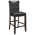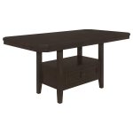 Dramatic design vibes are embellished with bonus storage space and a sensible configuration, perfect for turning your casual space into a haven for entertaining. Anchored by a counter-height dining table, this counter dining set offers extra height, always a plus for extended dining and casual coffee hours. Deep cappuccino finish wood construction emulates a modern farmhouse motif with a thick tabletop and a butterfly leaf to extend its length. A built-in lower cabinet makes space for serve ware on shelving behind four doors and an open shelf on top. Counter chairs feature matching cappuccino finish wood construction with cutout top details and black leatherette upholstery.
